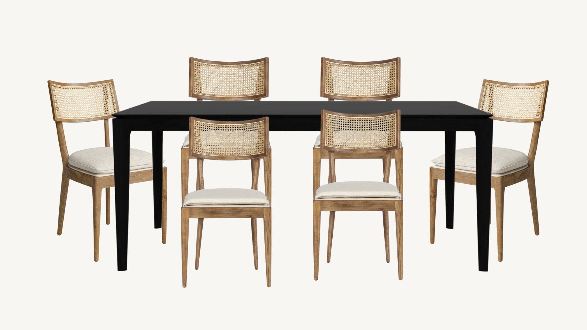 A beautifully curated dining set combining timeless silhouettes and high-quality craftsmanship. The solid dining set from Perigold features a black oak Bok Dining Table by Ethnicraft which anchors the space with its clean lines and signature airy shape. Paired with six Four Hands Britt dining chairs featuring natural cane backs, solid wood frames, and ivory performance linen-blend seats, this set brings both warmth and contrast.