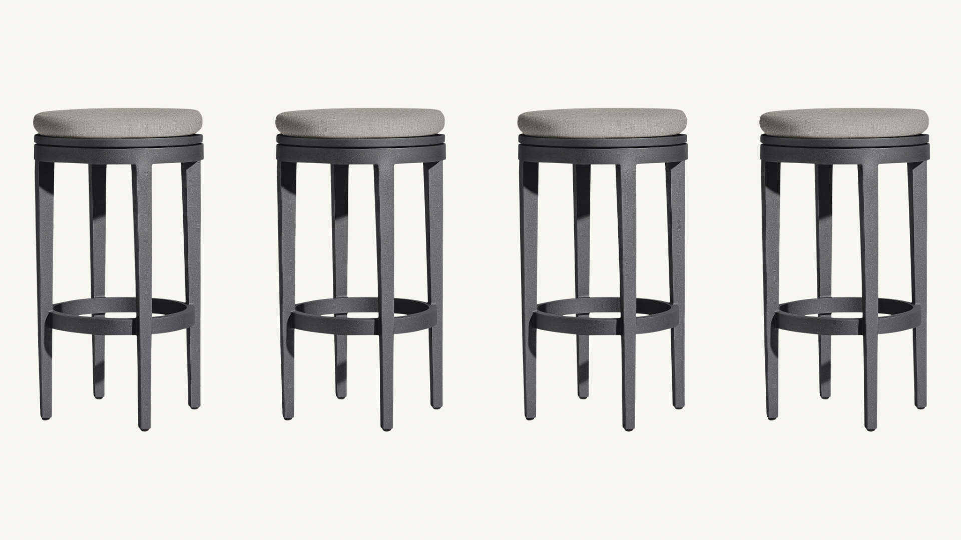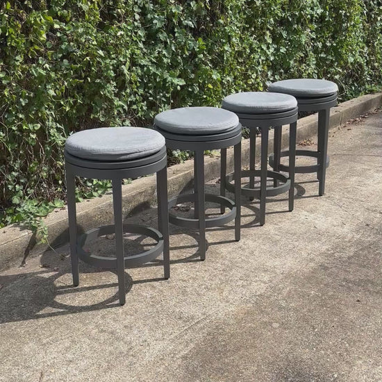 Sleek and sculptural, this set of four RH Balmain Swivel Stools blends classic architectural lines with everyday functionality. Crafted from all-weather powder-coated aluminum in the Slate finish and topped with Nickel Performance Textured Weave quick-dry cushions, each stool swivels 360° and features a streamlined silhouette with a recessed base. Designed for indoor or outdoor use, with cushions that Velcro into place.