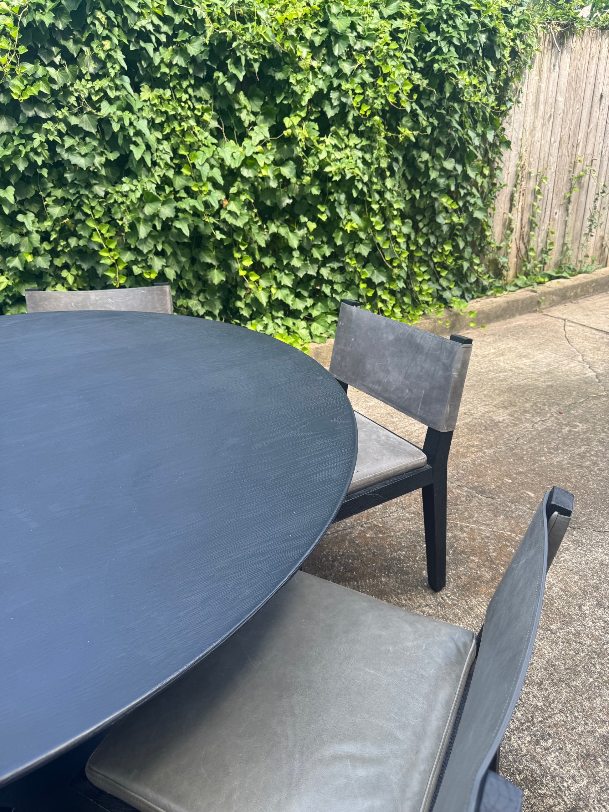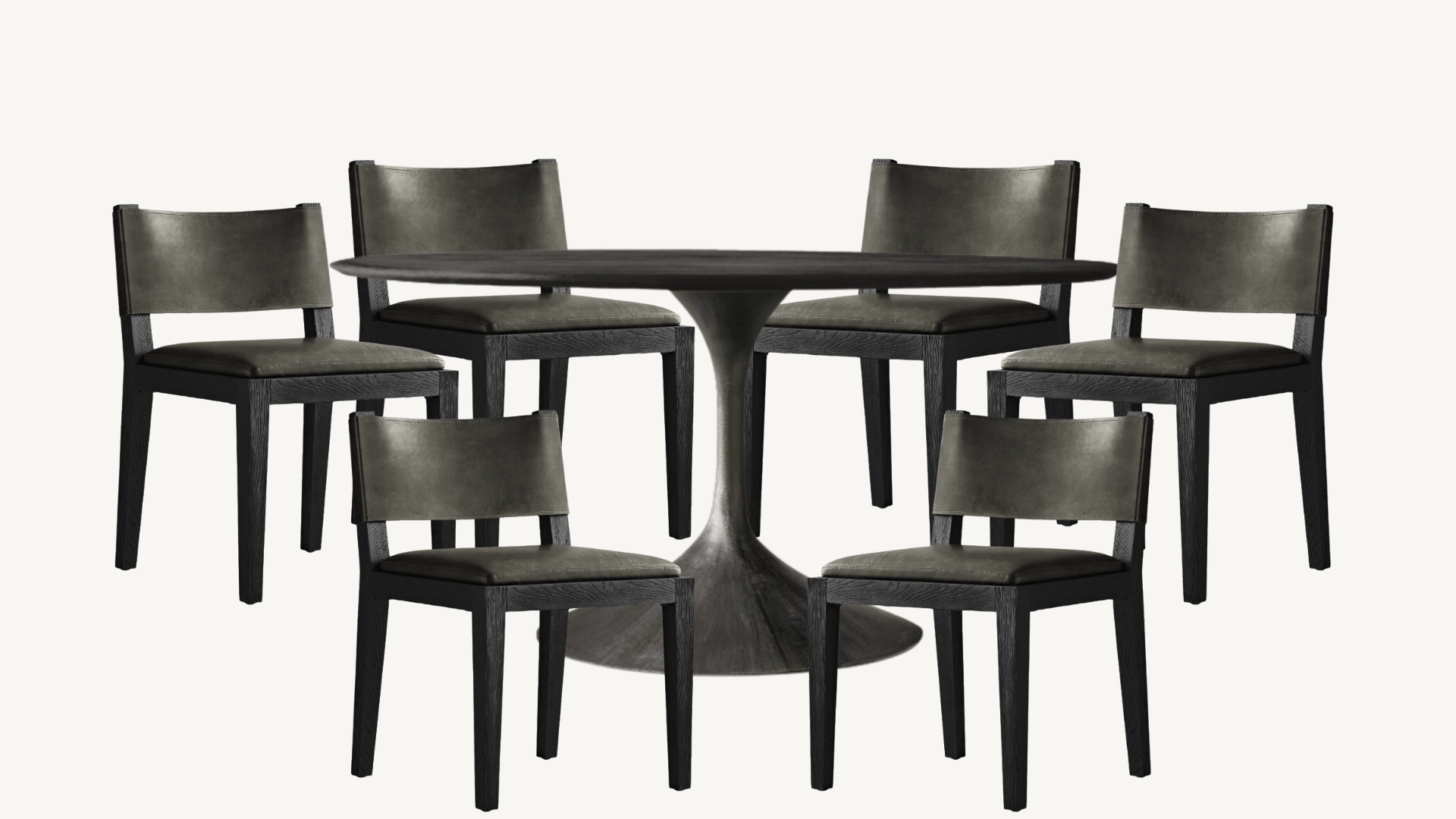 This stunning RH dining set includes the 60” Aero Round Dining Table in Black Oak with a sculptural cast iron base, paired with six Saddle Leather Dining Side Chairs upholstered in premium Italian Brompton leather (Pewter) and finished in rich Black Oak. A modern silhouette meets timeless materials—perfect for elevating any dining space. Both in great condition, with natural scratches/ leather patina on the chairs & small spots on table.