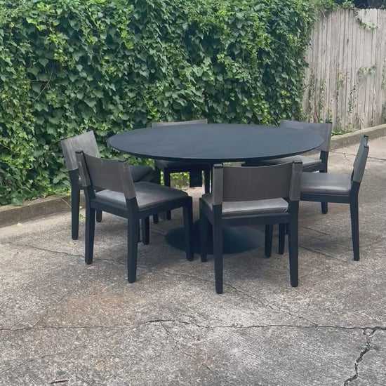 RH Dining Set Aero Cast Iron Black Oak 60” Round Dining Table & Set of 6 Saddleback Gray Leather Dining Chairs Restoration Hardware