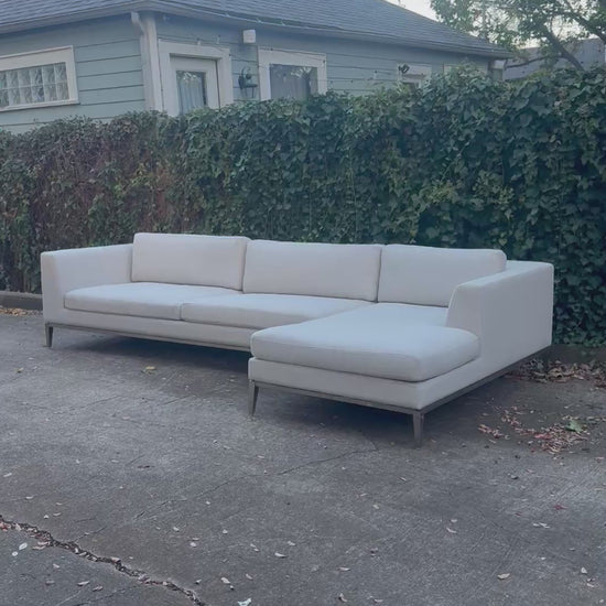 A stunning statement piece from RH’s Italia collection, this sectional blends mid-century Italian design with modern minimalism. Upholstered in a two-tone gray Perennials Performance fabric, it offers exceptional durability and stain resistance without sacrificing style. The polished metal base adds a sleek architectural touch, and the spacious 11.5-foot frame with an extended 70-inch chaise ensures maximum comfort!