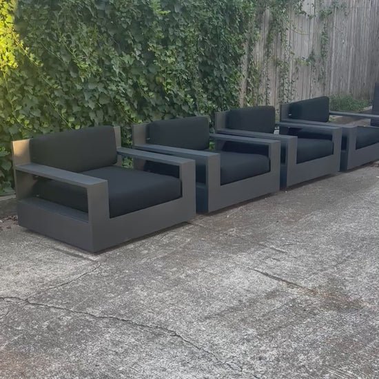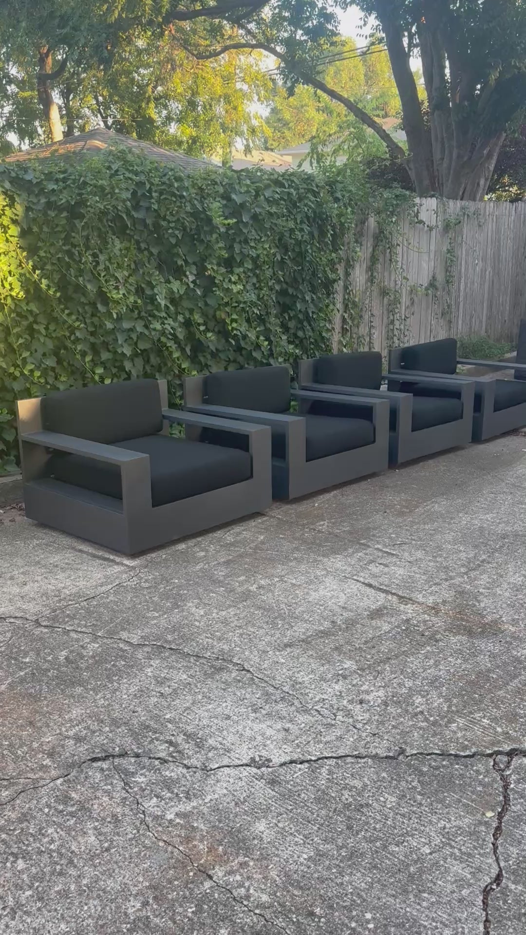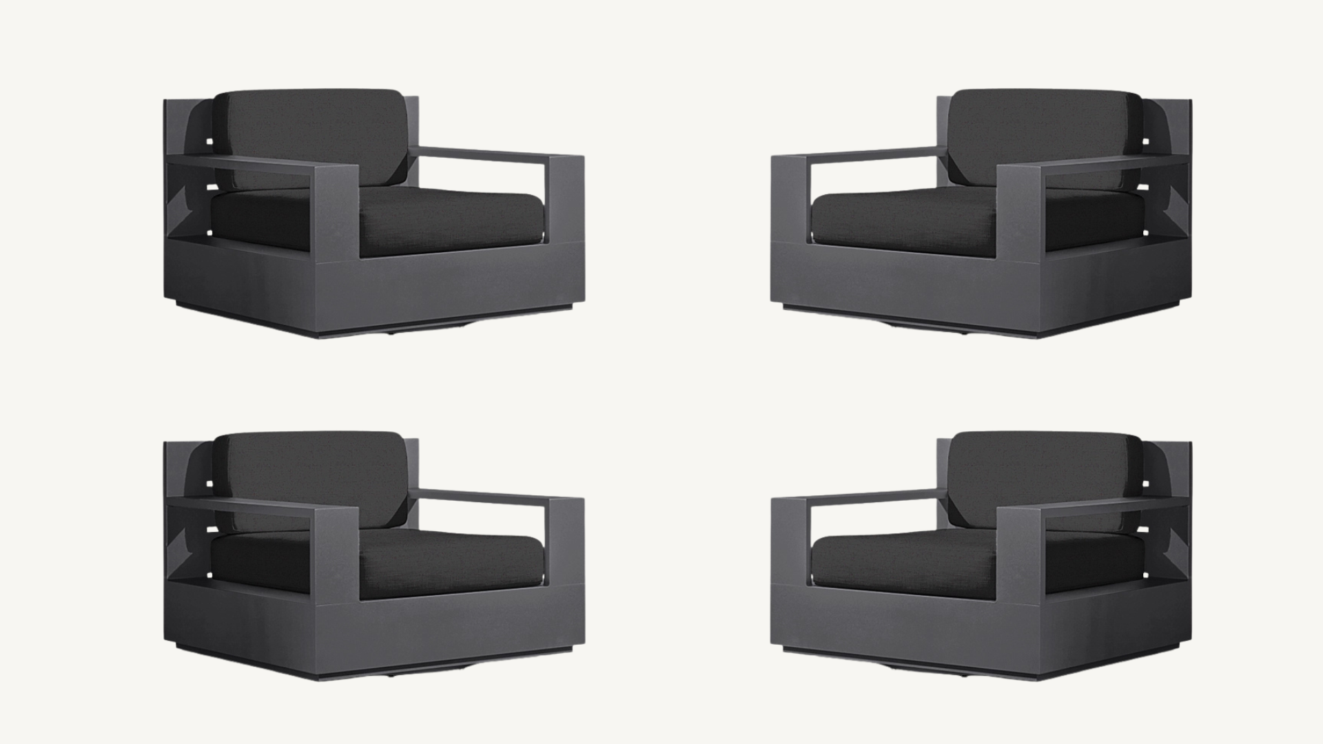 Architectural and built to endure, these RH Marbella swivel chairs feature solid slate aluminum frames with a low-profile silhouette and wide, angular arms. The hidden 360° swivel base allows for smooth motion, while upgraded Quick-Dry cushions in black Sunbrella canvas offer both comfort and practicality. Perfect for patios, poolside, or modern lounge areas.