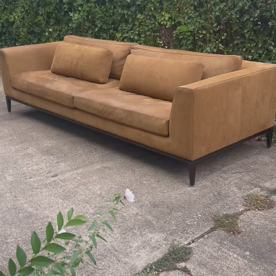 This RH Italia Leather Track Arm Sofa blends mid‑century modern design with luxurious craftsmanship. Hand‑assembled in North America, it features a streamlined frame elevated on a burnished bronze metal base. Upholstered in rich Italian nubuck leather in Chestnut, the sofa’s minimalist silhouette and down‑feather cushions create an inviting and elegant seat perfect for elevated living spaces. Nubuck is like a blend between suede and leather, which makes this piece incredibly soft and comfortable.